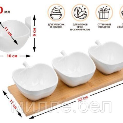 Размер одной менажницы: 11х10х6 см Объем одной менажницы: 300 мл Размер подставки: 32х11 см Материал: фарфор, бамбук Назначение: для сервировки