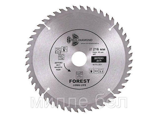 Диск пильный 216х30 мм 48 зубьев TRIO-DIAMOND Forest Long Life (FLL831) предназначен для распила древесины, ДСП, фанеры. Угол заточки 15 градусов. Максимальное число оборотов 7000 RPM.