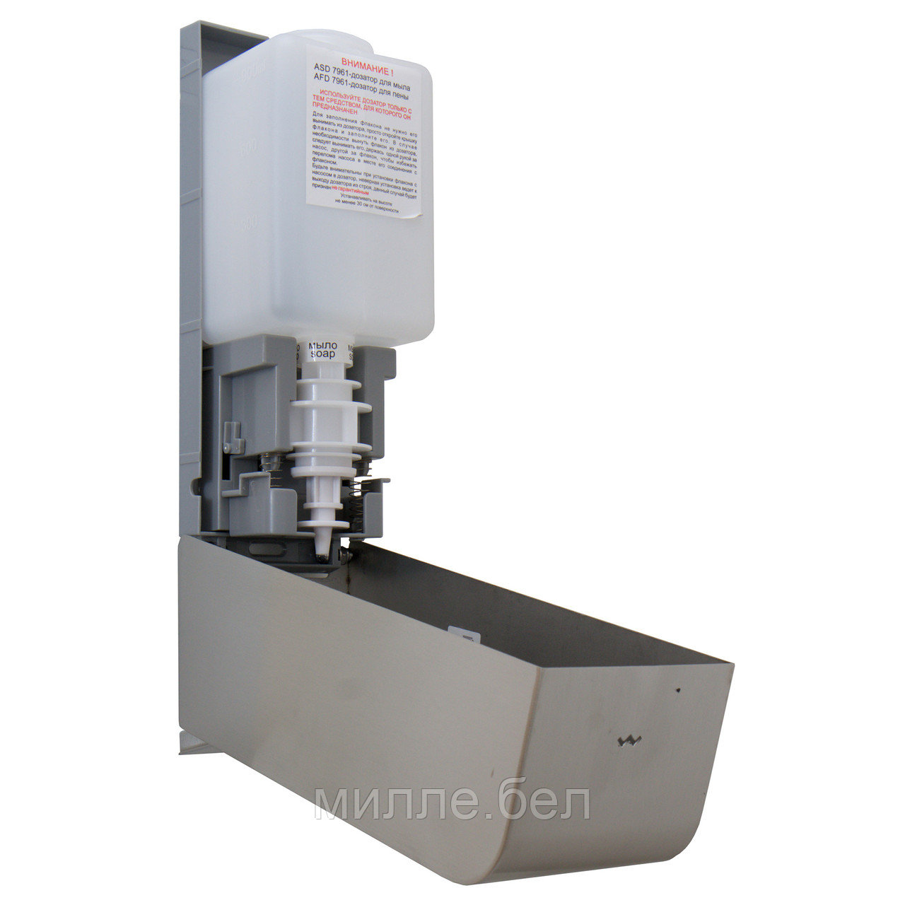 Дозатор изготовлен в современном стиле, имеет съёмную пластиковую ёмкость, что упрощает процесс очистки и обработки механизмов дозатора.