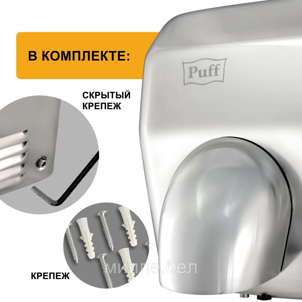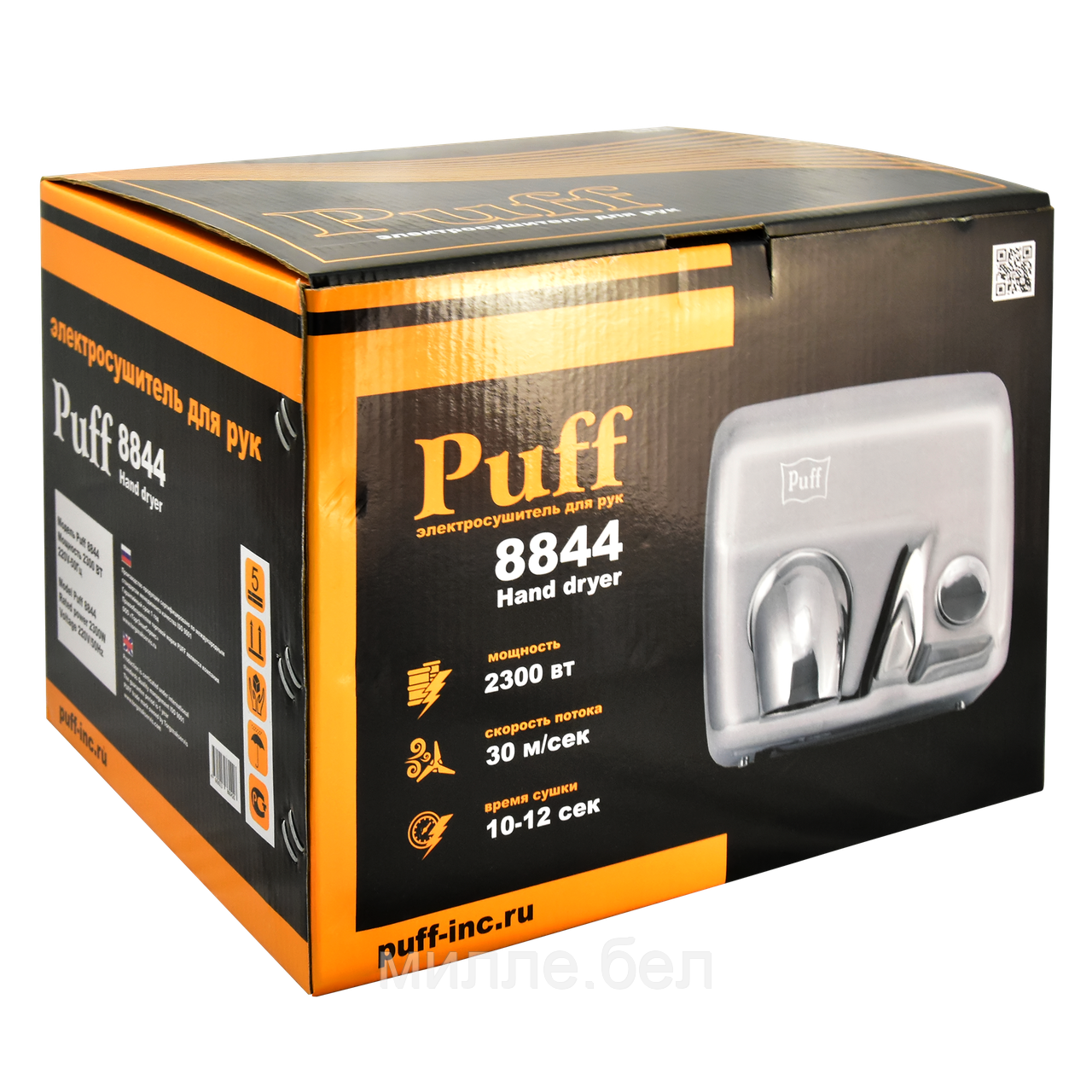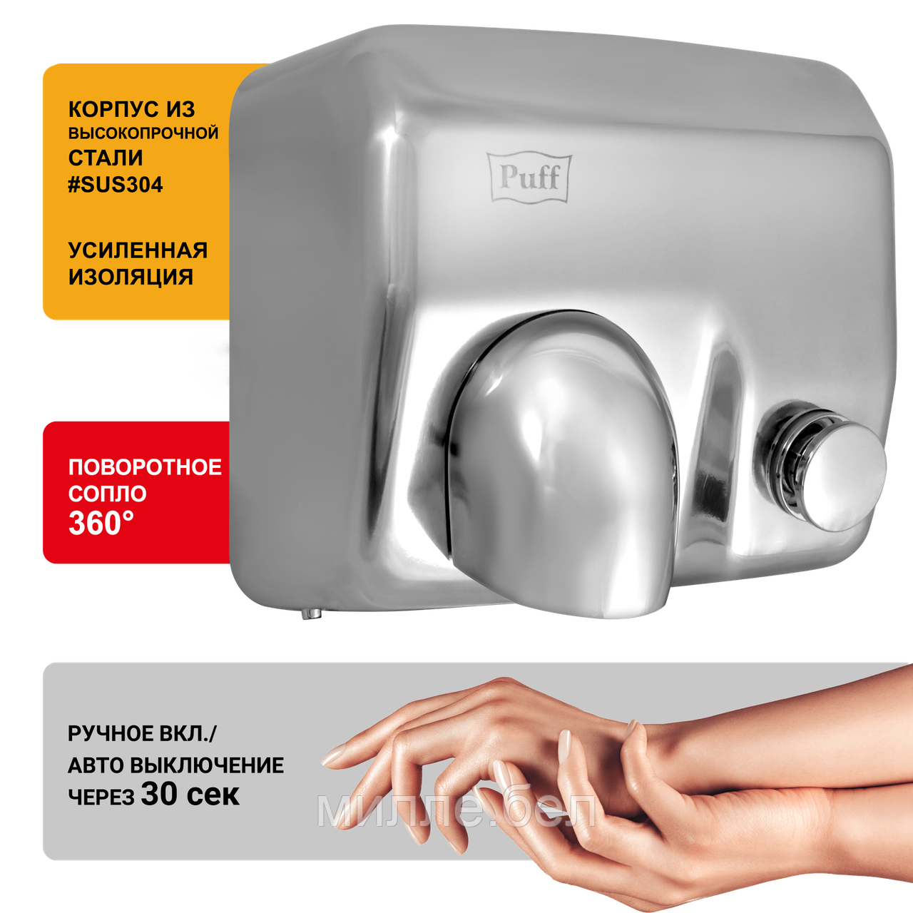 Для комфортной сушки рук Puff-8844 оборудована нагревательным элементом и вращающимся на 360 градусов соплом, что способствует удобному прогреванию исходящего потока воздуха до температуры 40-54 ºС, при этом скорость потока 30 м/с. А для создания необходимой безопасности во время эксплуатации электросушилка снабжена термоконтроллером и предохранителем от перегрева. Прибор является удобным и эффективным в применении за счет достаточно высокой мощности и низкого уровня шума.