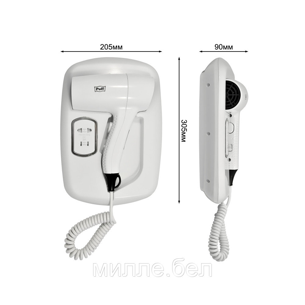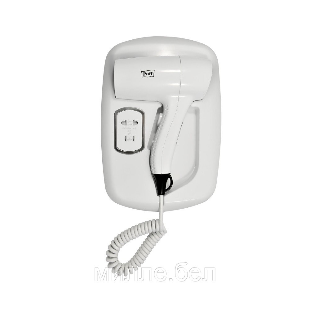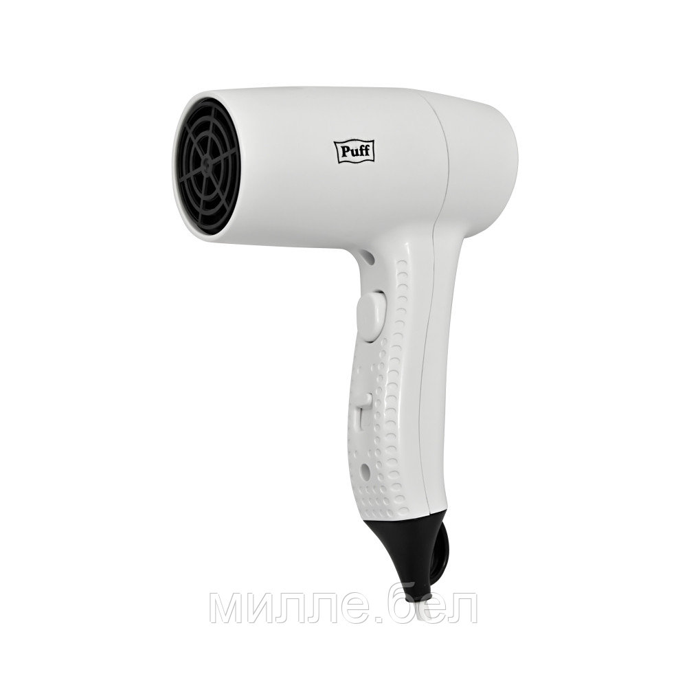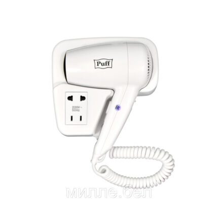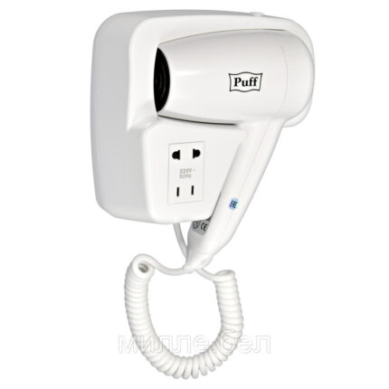 Фен для волос Puff-1203В предназначен для стационарного монтажа в туалетных и ванных комнатах. Включение кнопкой на ручке.