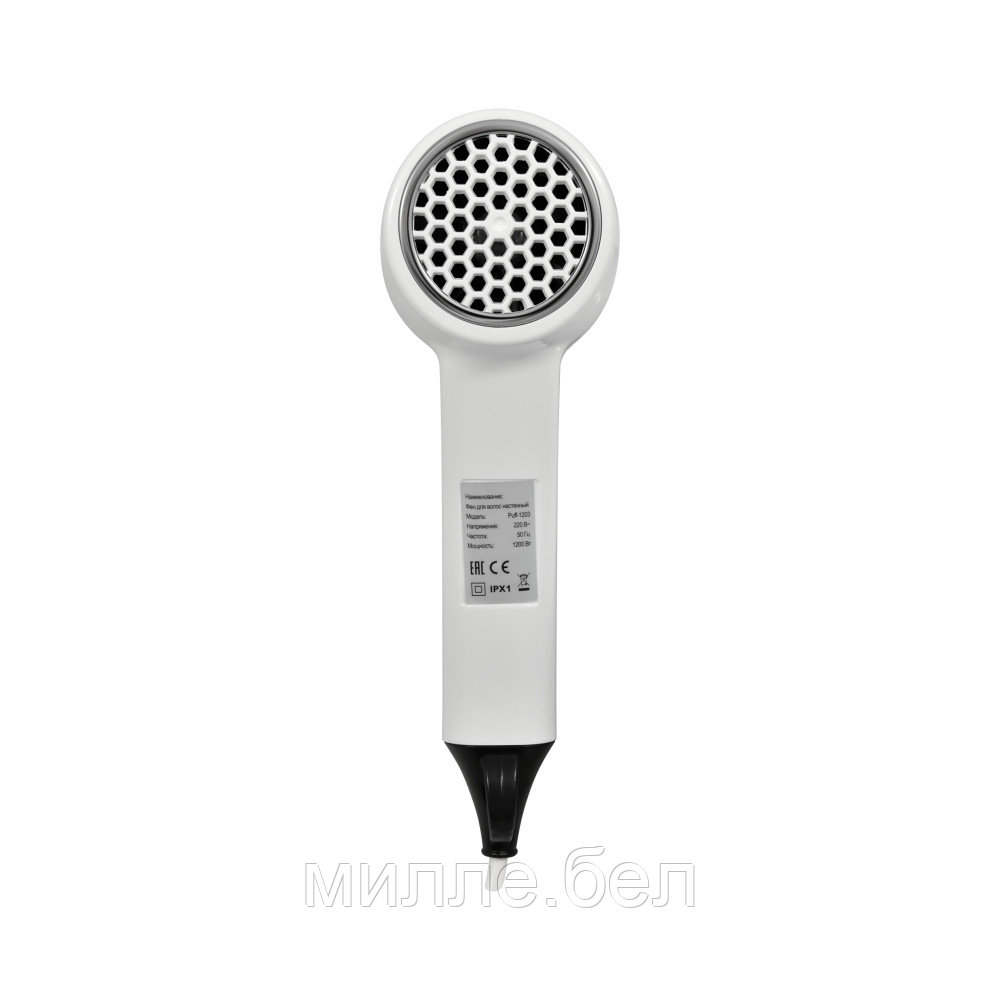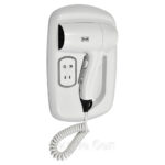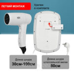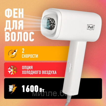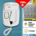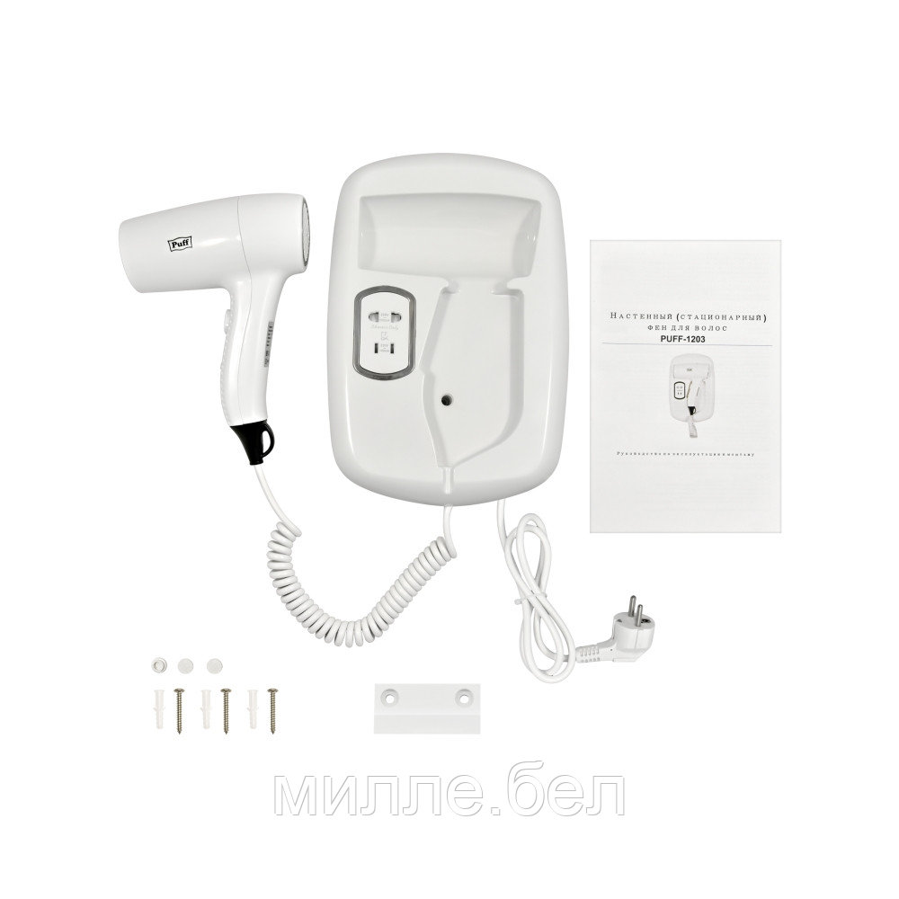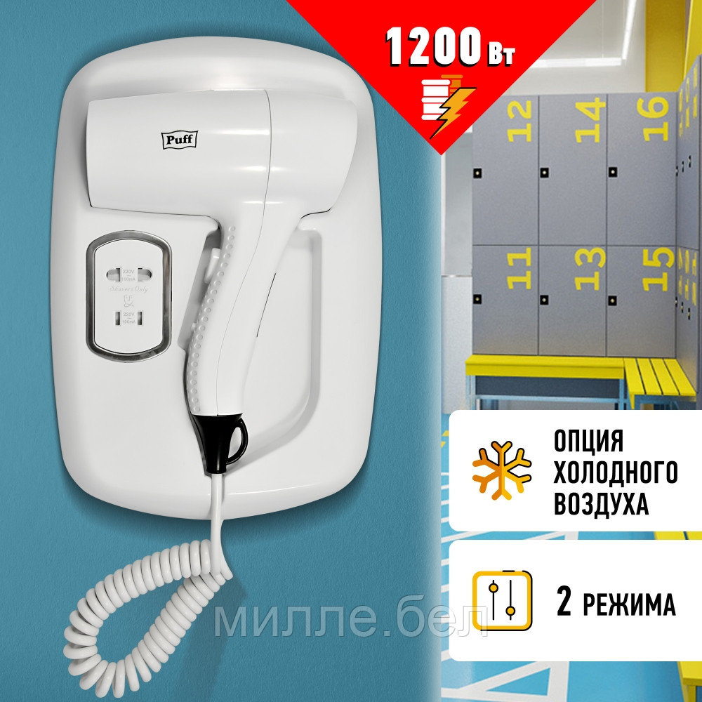 Фен для волос Puff-1203В предназначен для стационарного монтажа в туалетных и ванных комнатах. Включение кнопкой на ручке.