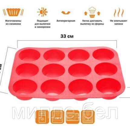 Форма для выпечки, силиконовая, прямоугольная на 12 кексов, 33 х 25 х 3 см, красная, PERFECTO LINEA