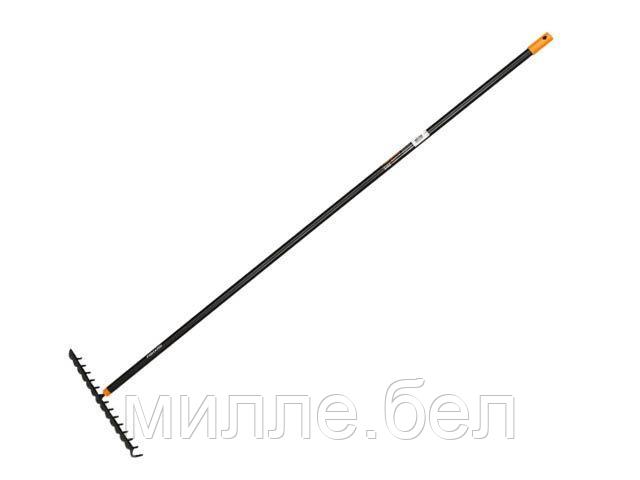 Грабли зубчатые FISKARS Solid обеспечивают легкую уборку между кустами. Черенок выполнен из прочного и легкого алюминия, насадка — из закаленной борсодержащей стали. Черенок несъемный.