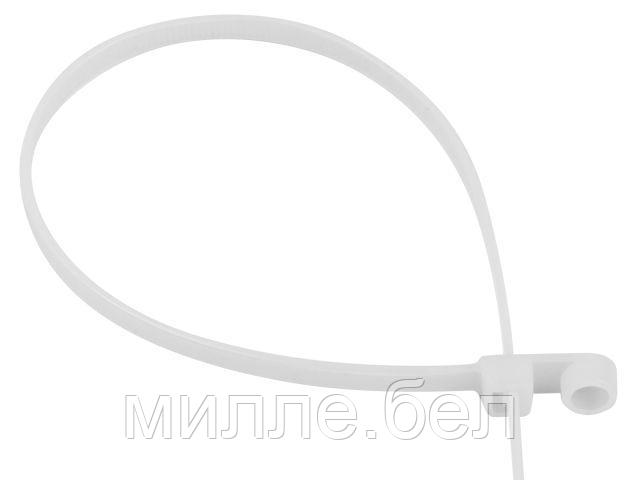 Нейлоновая хомут-стяжка с монтажным отверстием — крепёжный элемент для фиксации и организации кабелей, проводов, шлангов и труб с возможностью крепления к поверхности. Помимо стандартной зубчатой ленты с самоблокирующимся замком, имеет расширенную головку с отверстием под винт или саморез. Это позволяет одновременно стянуть пучок кабелей и закрепить его на стене, потолке, панели или другой опорной конструкции.