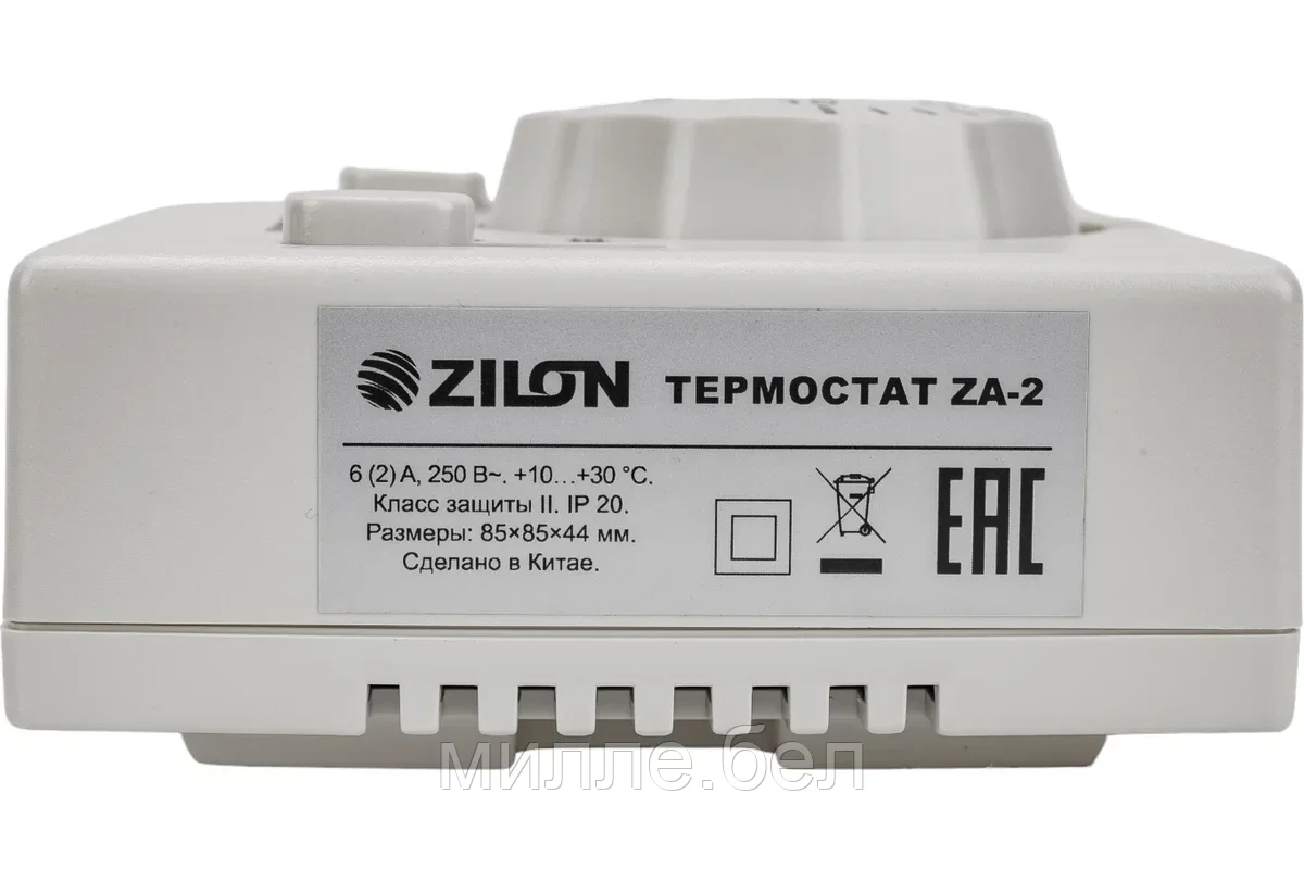 Zilon ZA-2 – комнатный термостат для тепловых завес Zilon, применяется для управления тепловой завесой (включение/выключение), регулирования температуры. Данный термостат не устанавливается в помещениях с повышенной влажностью и в агрессивных средах. В качестве чувствительного элемента используется сильфон, заполненный газом. Корпус выполнен из высококачественного пластика.