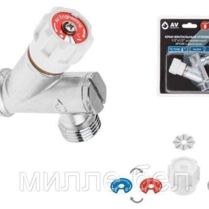 Кран вентильный угловой 1/2″ нар. Х 3/4″ нар. установочный ХРОМ для стир. машины с фильтром, AV Engi (Латунь,