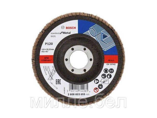 Лепестковый шлифкруг X431 BOSCH Standard for Metal 115 мм К 120, угловое исполнение — EN 13743 применяется для обработки металла.