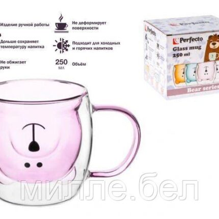 Кружка стеклянная с двойными стенками, 250 мл, розовая, серия Bear, PERFECTO LINEA (Стеклянная кружка ручной