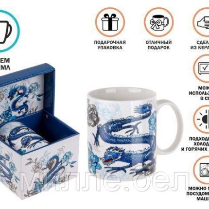 Материал: керамика Объем: 360 мл Назначение: для холодных и горячих напитков Кружка украшена принтом дракона — символом плодородия, жизни, света,