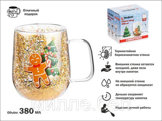 Кружка стеклянная с двойными стенками, 380 мл, серия CHRISTMAS-2, PERFECTO LINEA (Стеклянная кружка ручной