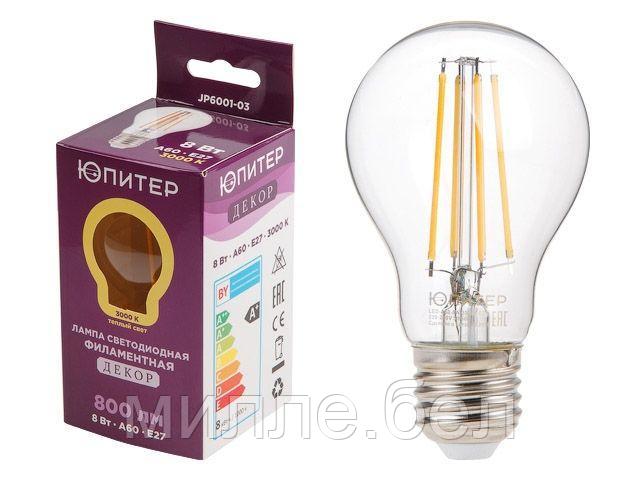 Лампа светодиодная филаментная A60 СТАНДАРТ 8 Вт E27 3000К ЮПИТЕР ДЕКОР (75 Вт аналог лампы накал., 800Лм)