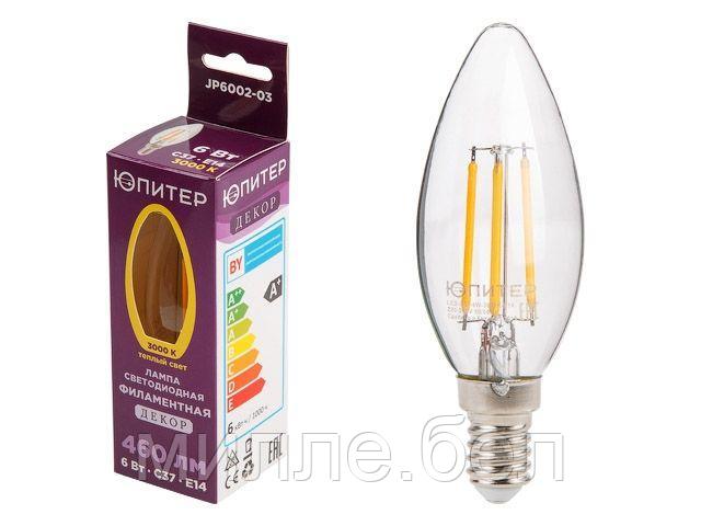Лампа светодиодная филаментная C37 СВЕЧА 6 Вт E14 3000К ЮПИТЕР ДЕКОР (60 Вт аналог лампы накал., 560Лм)
