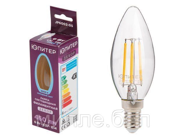 Лампа светодиодная филаментная C37 СВЕЧА 6 Вт E14 4000К ЮПИТЕР ДЕКОР (60 Вт аналог лампы накал., 560Лм)