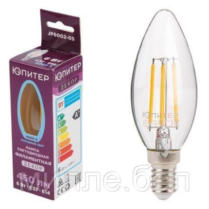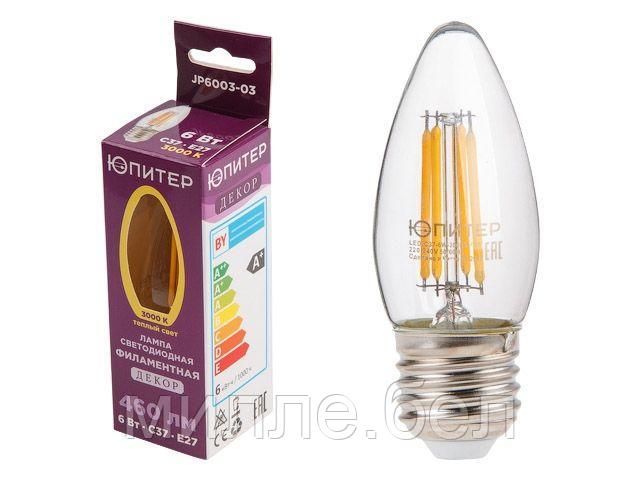Лампа светодиодная филаментная C37 СВЕЧА 6 Вт E27 3000К ЮПИТЕР ДЕКОР (60 Вт аналог лампы накал., 560Лм)