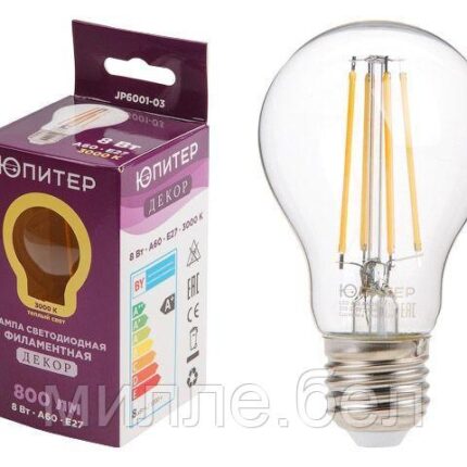 Лампа светодиодная филаментная A60 СТАНДАРТ 8 Вт E27 3000К ЮПИТЕР ДЕКОР (75 Вт аналог лампы накал., 800Лм)