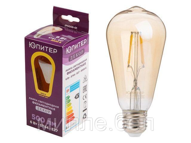 Лампа светодиодная филаментная ST64 6 Вт E27 3000К ЮПИТЕР ДЕКОР (60 Вт аналог лампы накал., 600Лм)