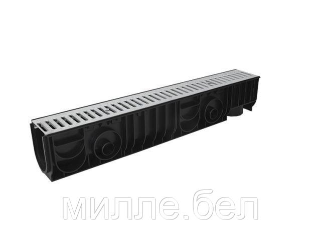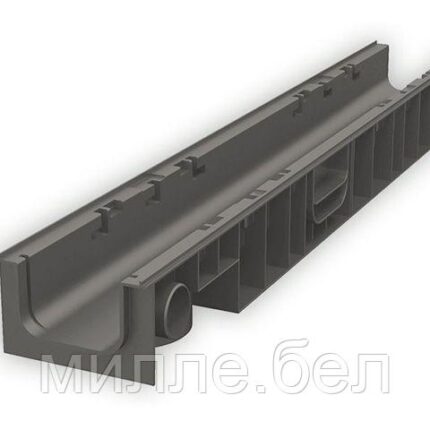 Канал пластиковый системы STANDART из вторичного ПЭ-ПП. Сформированное отверстие для подключения труб O 110 для выпуска через дно лотка. Боковое сформированное отверстие для подключения труб O 50 мм и O 100. Специальный паз для подключения других лотков под углом 90? и специальным пазом для распила лотка. Оцинкованная стальная решетка. Крепление: стальная оцинкованная планка с болтом. Класс нагрузки А 15