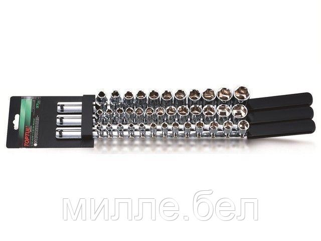 Набор головок из 37 предметов на подвесе TOPTUL включает в себя 13 головок на 14 (4-14 мм), 13 головок на 38 (7-21 мм) и 11 головок на 12 (10-22 мм). Все элементы изготовлены их хром ванадия. Рекомендуется для профессионального использования.