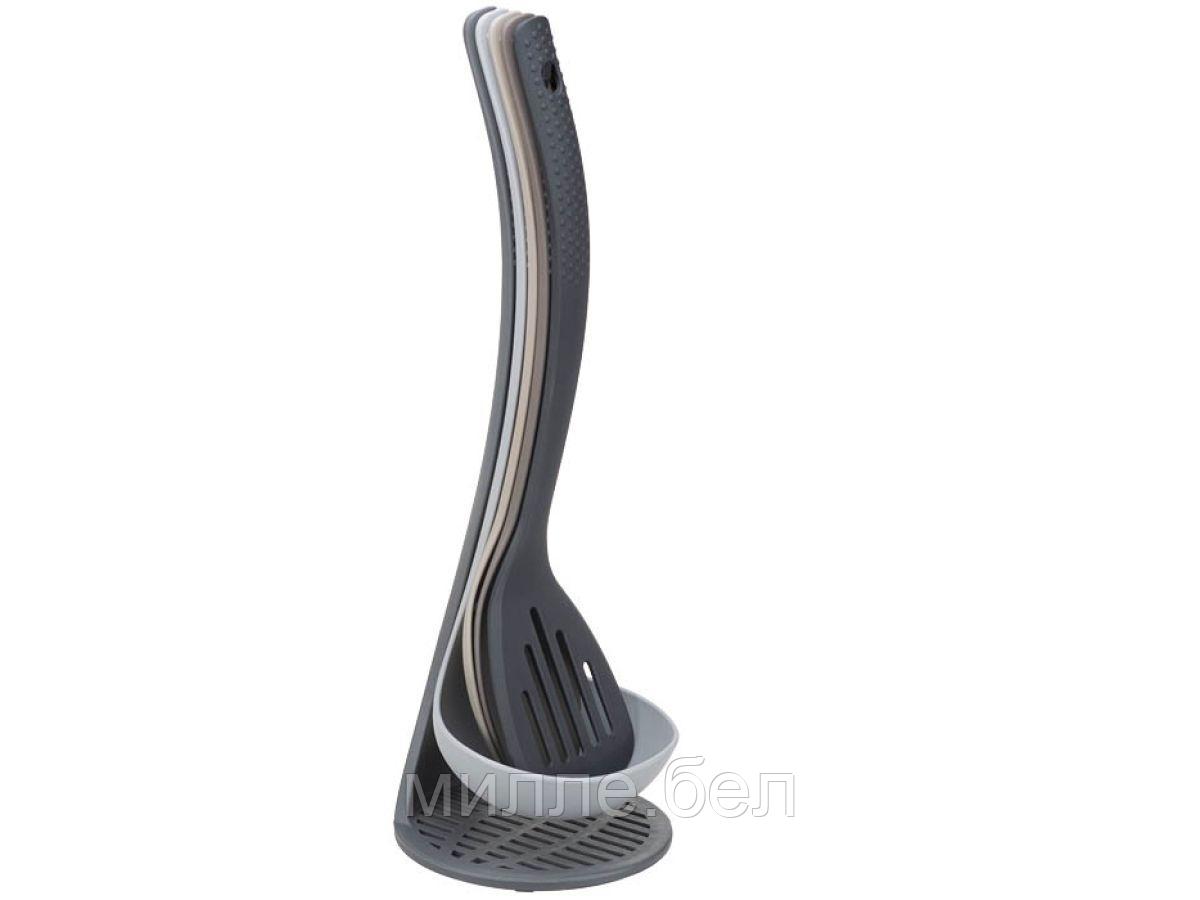 Артикул: М 1270, Материал: полиамид, Габариты: 115x115x350 мм. Включает в себя: толкушку (она же служит подставкой), половник, шумовку, ложку и лопатку. Все предметы легко соединяются друг с другом с помощью специального крючка на ручке, что обеспечивает компактное хранение. Особенность такого крепления позволяет легко извлечь нужный предмет, а остальные аккуратно расположить на своих местах, поддерживая идеальный порядок на кухне. Длинные ручки позволяют работать с горячими кастрюлями и сковородками, не обжигая руки. Изделия изготовлены из высококачественного полиамида, устойчивы к повышенным температурам (до 210 °C) и не повреждают поверхность посуды. Не плавятся при перемешивании и переворачивании продуктов. Не оставлять на горячей сковороде! Не подвергать прямому воздействию огня! Можно мыть в посудомоечной машине.