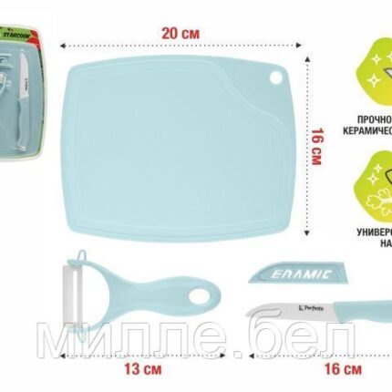 В наборе: нож кухонный, общая длина 16 см, нож для чистки 13 см, защитный чехол для ножа, доска разделочная 16х20 см