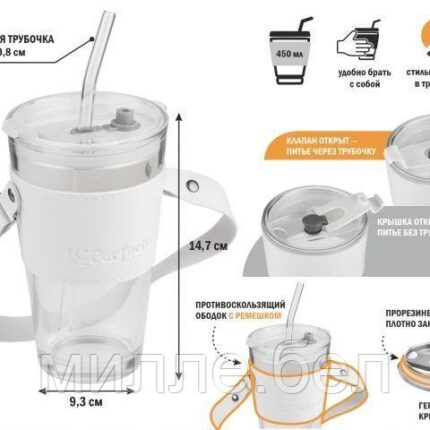 Стакан стеклянный (комплект) с трубочкой, кожаным ремешком и кейсом, 450 мл, Clear, PERFECTO LINEA