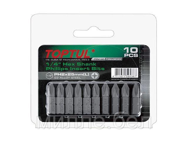 Насадка крестообразная PH2 25 мм 10 штук блистер TOPTUL (FSBA0802G) применяется в качестве сменной насадки для работы с крепежом с крестовым шлицем стандарта Philips.