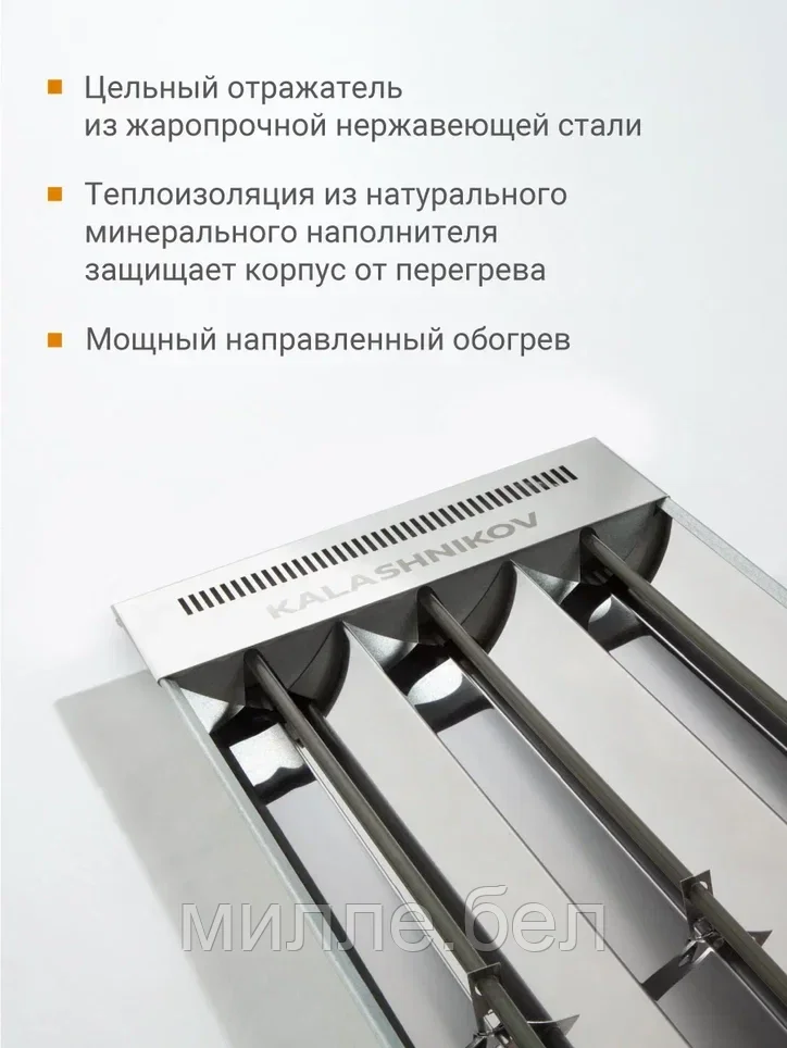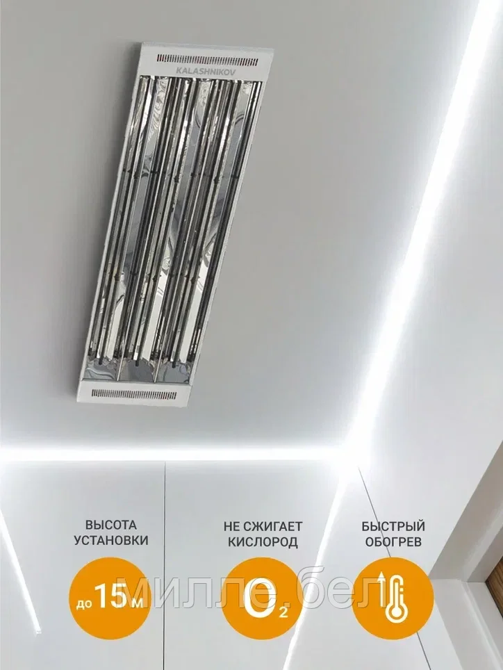 Инфракрасные обогреватели KALASHNIKOV могут устанавливаться под потолком или крепиться к стене под разным углом, обеспечивая направленное из-лучение для создания наиболее оптимальной зоны обогрева.