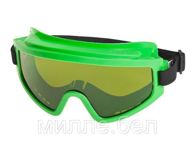 Очки с непрямой вентиляцией с панорамным защитным стеклом-светофильтром зелёного цвета из поликарбоната (РС Strong Glass) с влагостойким, двусторонним суперпрочным, твердым и одновременно незапотевающим покрытием (без потери свойств от времени).