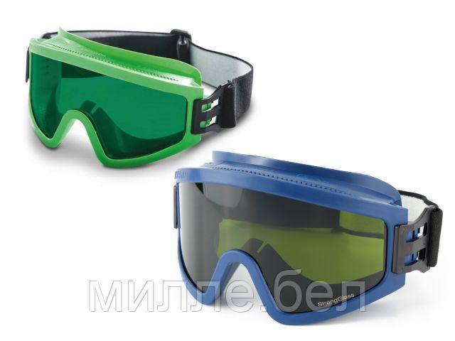 Очки с прямой вентиляцией с панорамным защитным стеклом-светофильтром зелёного цвета из поликарбоната (РС Strong Glass) с влагостойким, двусторонним суперпрочным, твердым и одновременно незапотевающим покрытием (без потери свойств от времени).