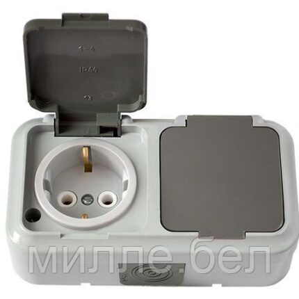 Розетка 2-ая (открытая, с/з, брызг. защ.) серая, Пралеска Аква, Bylectrica (IP54 пылебрызгозащищенные)