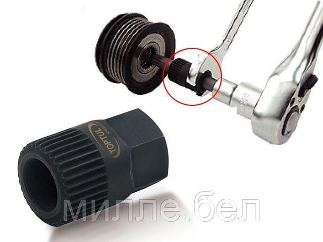 Съемник шкива генератора TOPTUL имеет специальную конструкцию для остановки шкива и снятия центрального крепежного болта. Применяется с 17 мм гаечным ключем и битой M10. Подходит для Audi, VW, Volvo и других автомобилей. Рекомендуется для профессионального использования.
