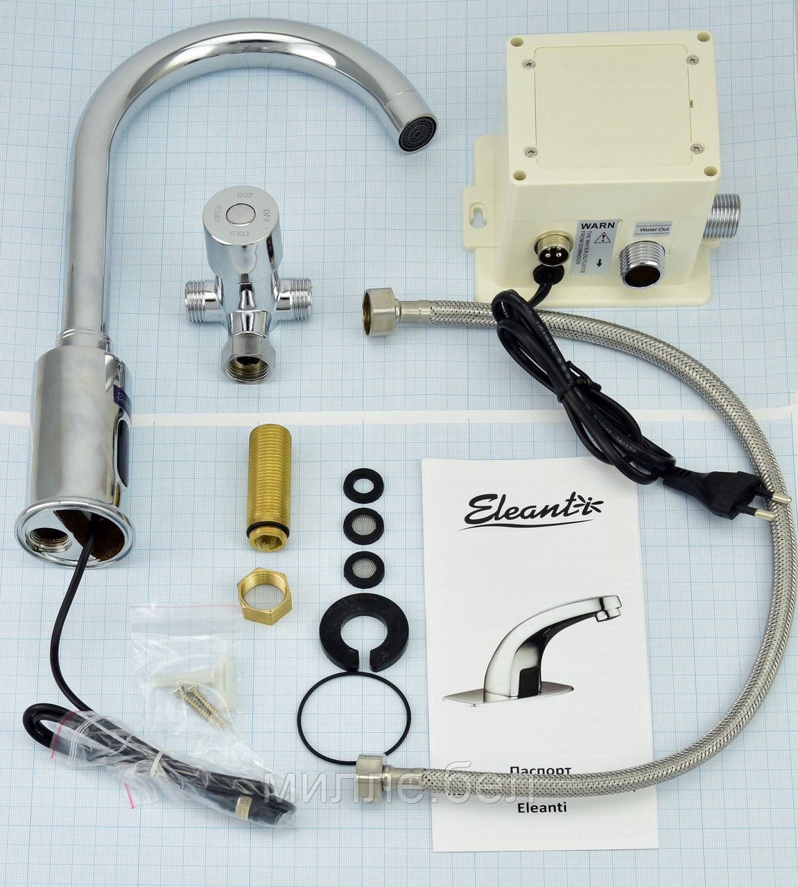 Сенсорный смеситель Eleanti 0402.517 для умывальника латунный Смеситель производится из латуни — надежного, долговечного материала. Окошко инфракрасного сенсора водонепроницаемое, антивандальное.