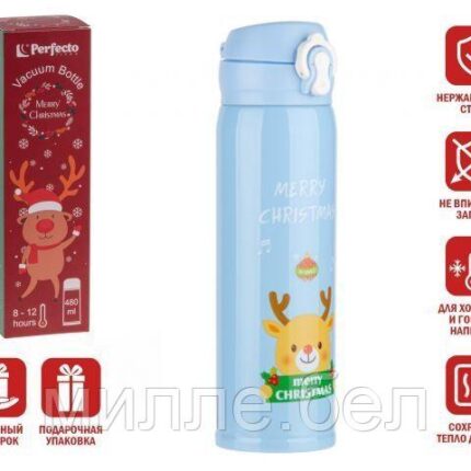 Термос, 480 мл, нержавеющая сталь, MERRY CHRISTMAS, голубой, PERFECTO LINEA