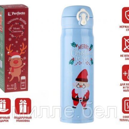 Термос, 480 мл, нержавеющая сталь, MERRY CHRISTMAS, голубой, Санта, PERFECTO LINEA