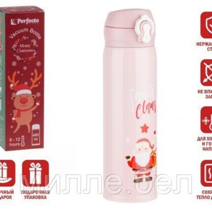 Термос, 480 мл, нержавеющая сталь, MERRY CHRISTMAS, розовый, PERFECTO LINEA