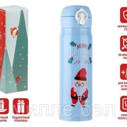 Термос, 500 мл, нержавеющая сталь, MERRY CHRISTMAS, голубой, Санта, PERFECTO LINEA