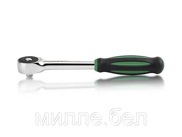 Трещотка снабжена колесом с 60 зубьями (для меньшего угла свободного хода), имеет переставной квадрат (для левого или правого вращения) и вращающуюся рукоятку для работы в труднодоступных, узких местах (возможность кручения квадрата осевым вращениям рукояти).