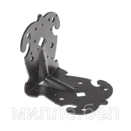 Уголок фигурный представляет собой металлическую пластину, согнутую под углом 90 градусов, со сторонами одинаковой длины. Дополнительная штамповка увеличивает жеcткость уголка и допустимую нагрузку. Имеет монтажные отверстия нескольких типов. Получил универсальное применение, когда элементы конструкции необходимо скрепить под углом 90 градусов. Широко используется при соединении перекрытий, стоек и других деталей из древесины и древесно-стружечных плит.