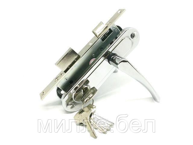 Врезной замок с сувальдным механизмом секрета. Комплектуется подпружиненными ручками. Оснащен 3-мя стальными ригелями диаметром 12 мм. — Технические характеристики: Размер